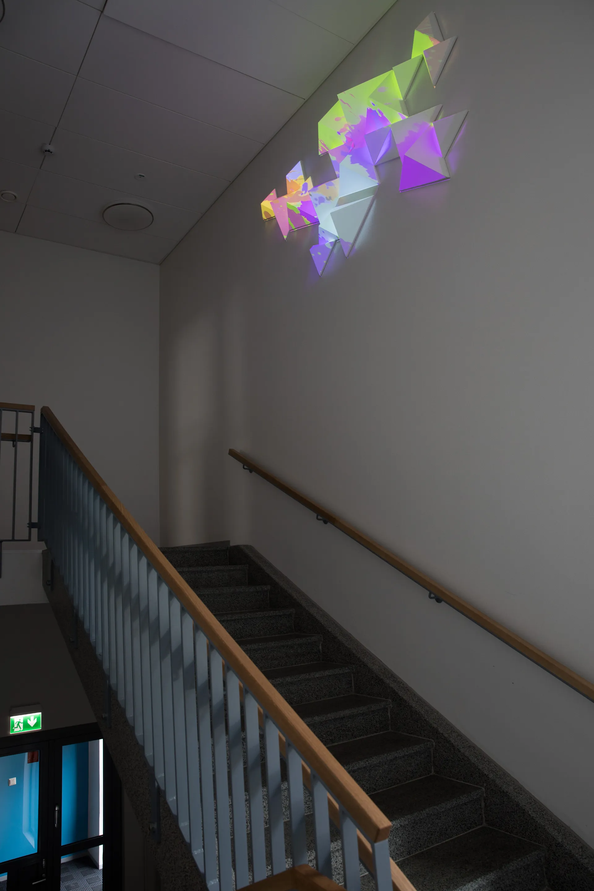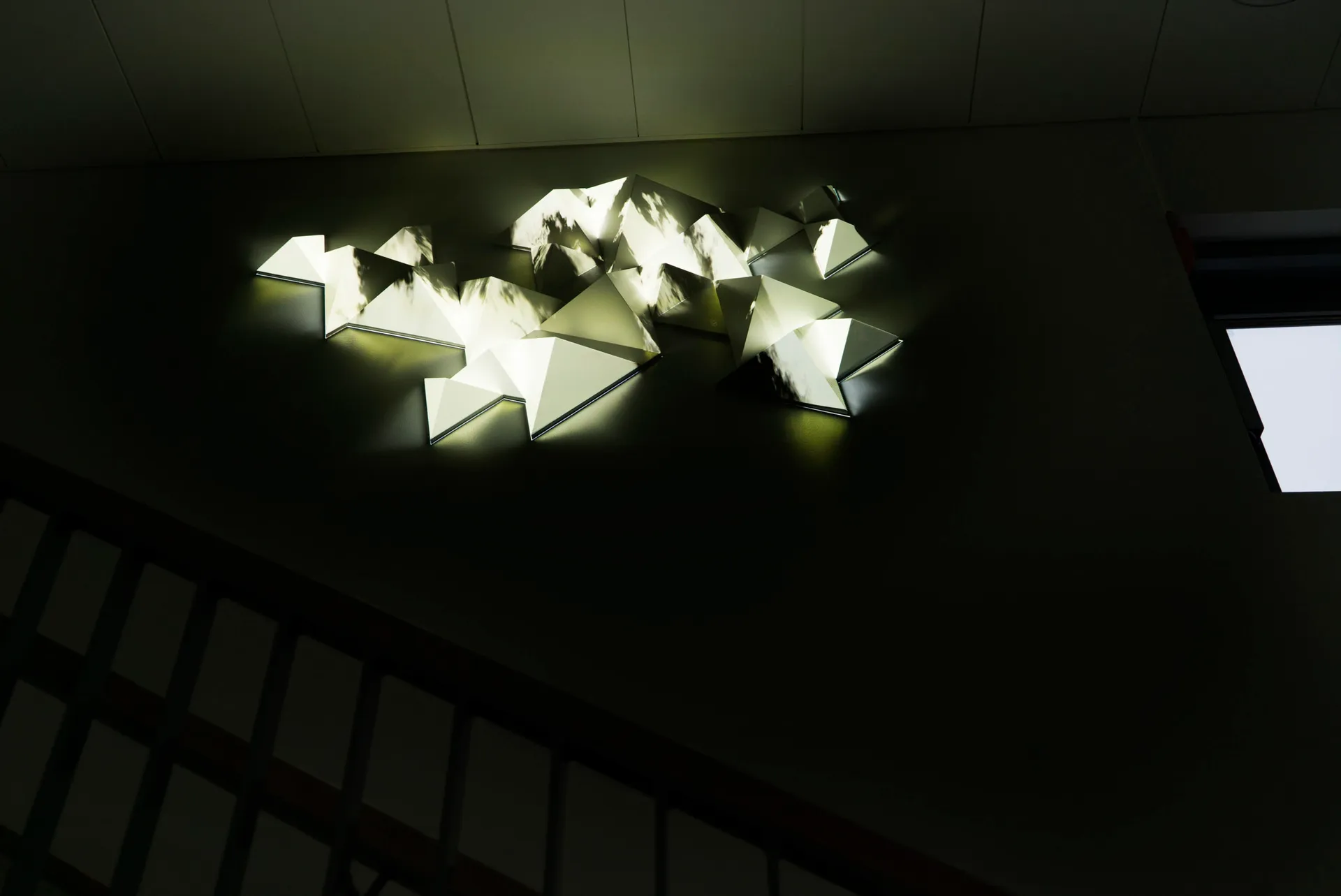 The main inspiration of the work comes from the history of the city of Outokumpu being a mining city. The main shape of the work is a three-dimensional triangle, which can be seen as triangulation used in mining. These triangular faces form a geometrical piece of a rock formation. The bigger piece is in the wing of natural sciences and this makes the stairway seem a little bit like a cave. In the video projection over the faces, there is a fake sunlight rising and setting in about 10-minute intervals. Also, from time to time, there is a searchlight searching for something from the rock. On the wall next to the bigger formation, there are several triangular pyramids with mirrors on one side. These mirrors point towards the installation, so that the real sunlight from the window allows the reflections to wander through the faces.