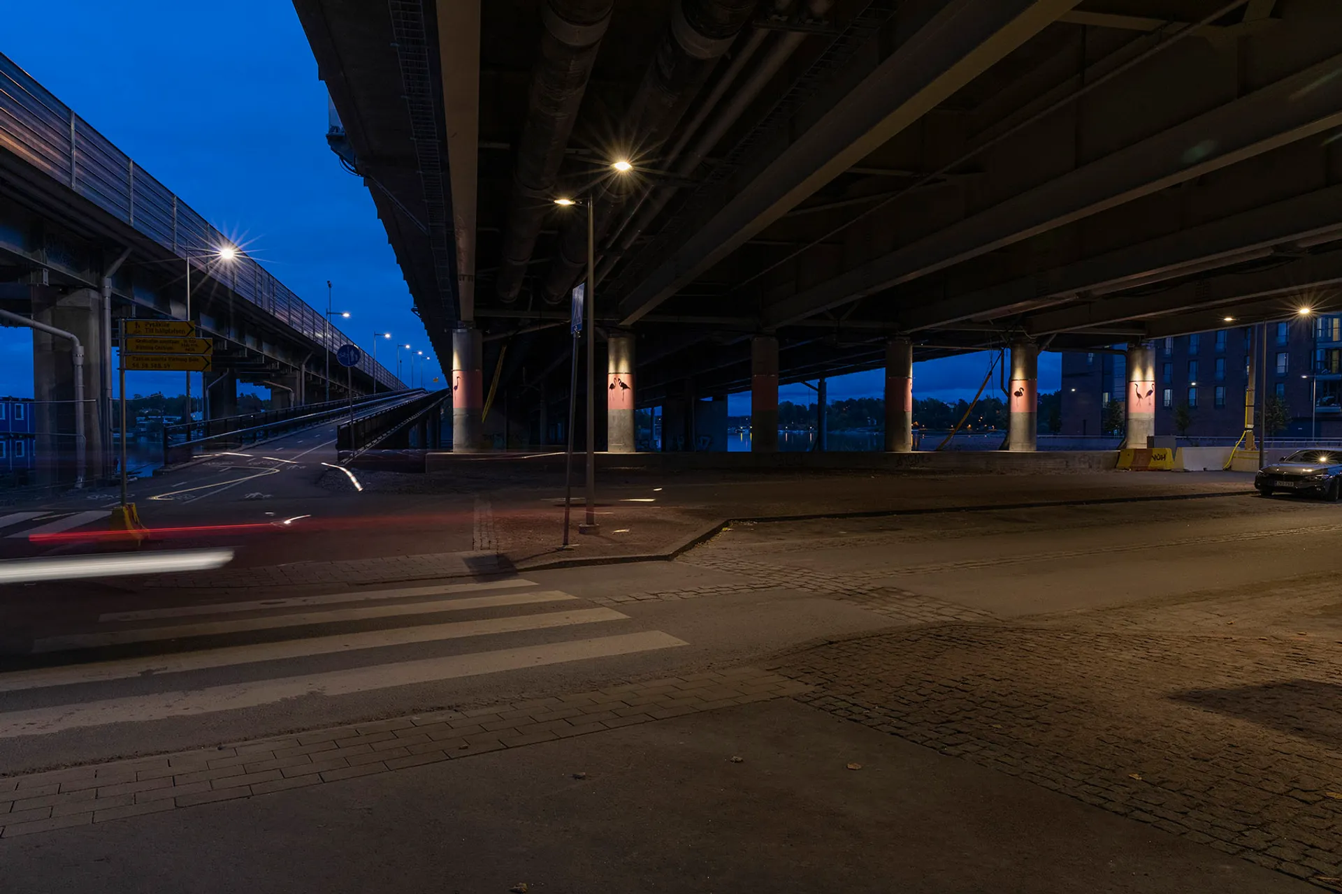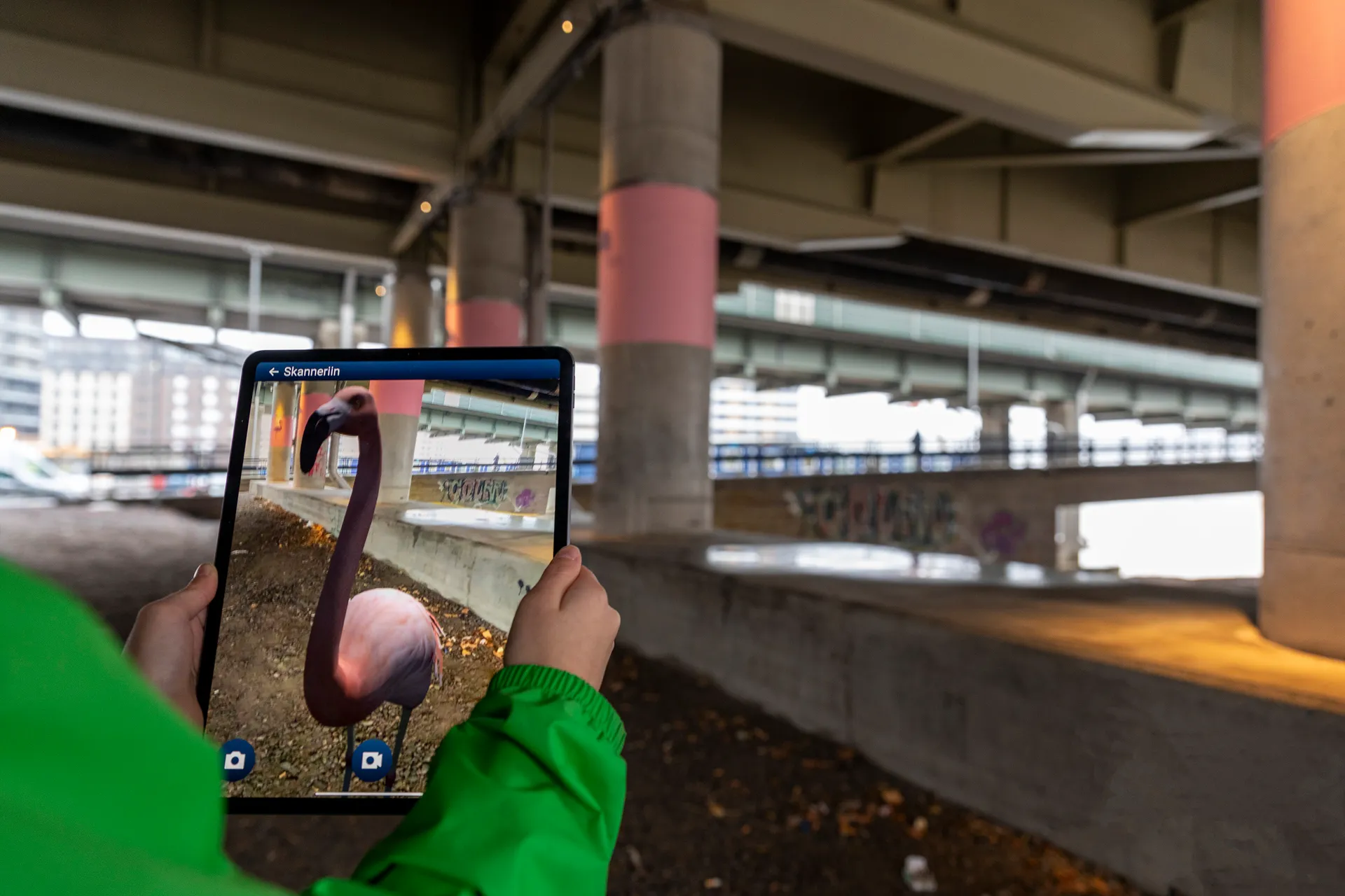 The work refers to the flamboyance of flamingos that used to live in Korkeasaari Zoo just across from Kalasatama. In 2010, a fox got into the zoo and mauled two flamingos. The rest of the birds died of shock. Bridge columns decorated with a flamboyance of moving flamingos with the help of steel elements and programmed lights make up the fixed part of the work. The other part is virtual, and it can be seen using the free-of-charge augmented reality (AR) application Arilyn on a smartphone. The application will display animated flamingos on the wasteland under the bridge.