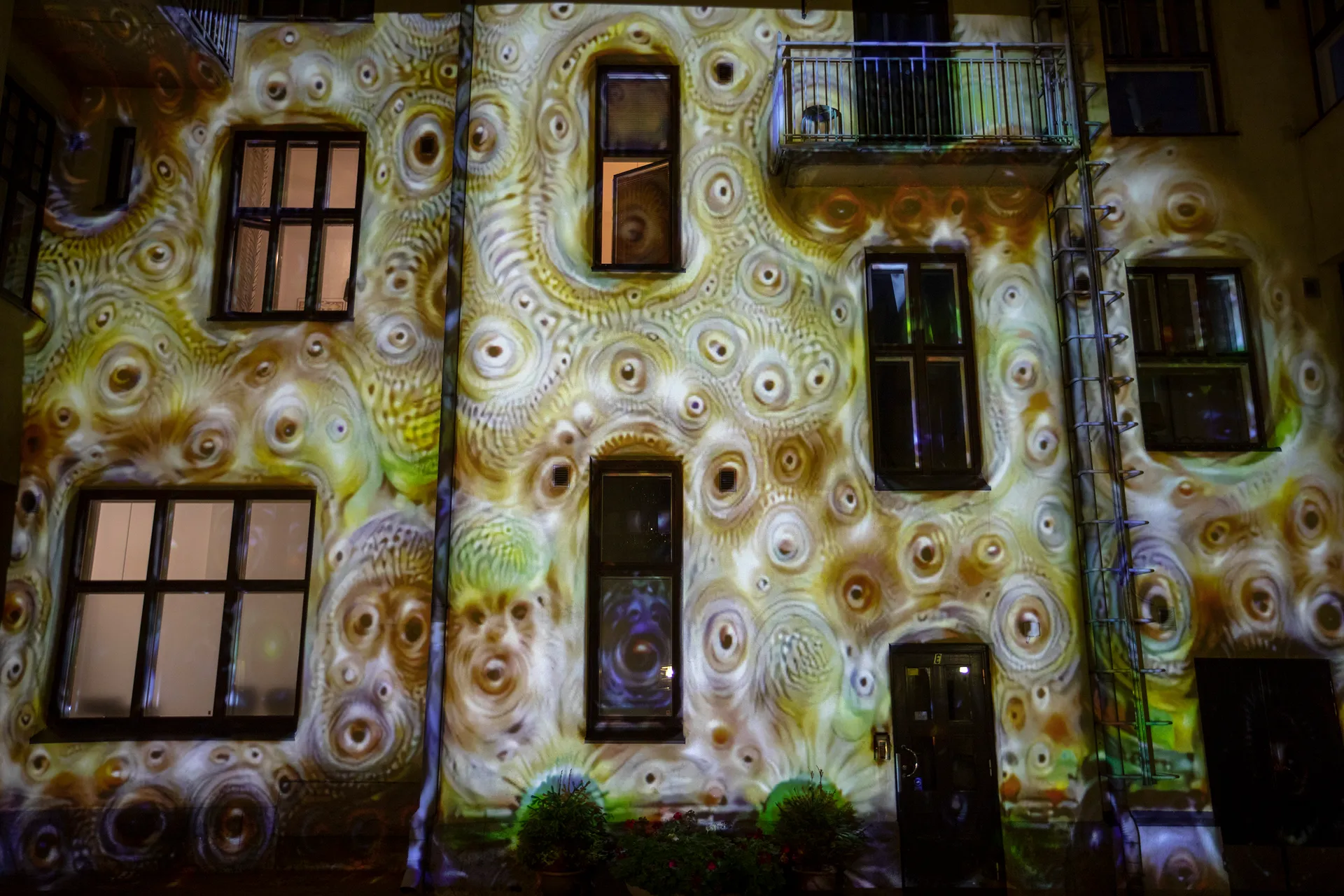 From the picture of the building the neural network created a version of its own. This version was used as a base of a 3D animation. The animation that was mapped to the this very same wall, slowly shows to the viewer a whole new picture about the building. The audience can enjoy the wall’s dreamy new appearance and the soundscape that follows the animation.